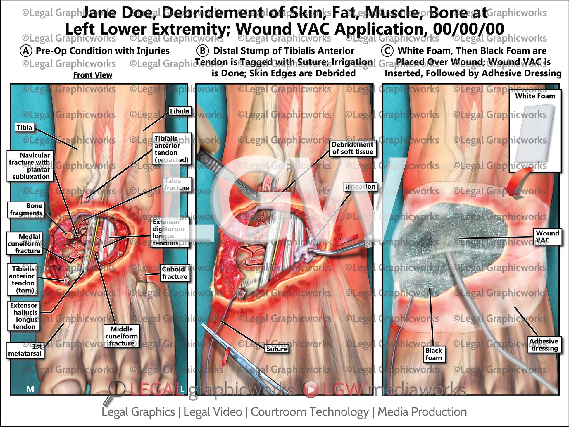 Debridement of Skin, Fat, Muscle, Bone at Left Lower Extremity; Wound VAC Application