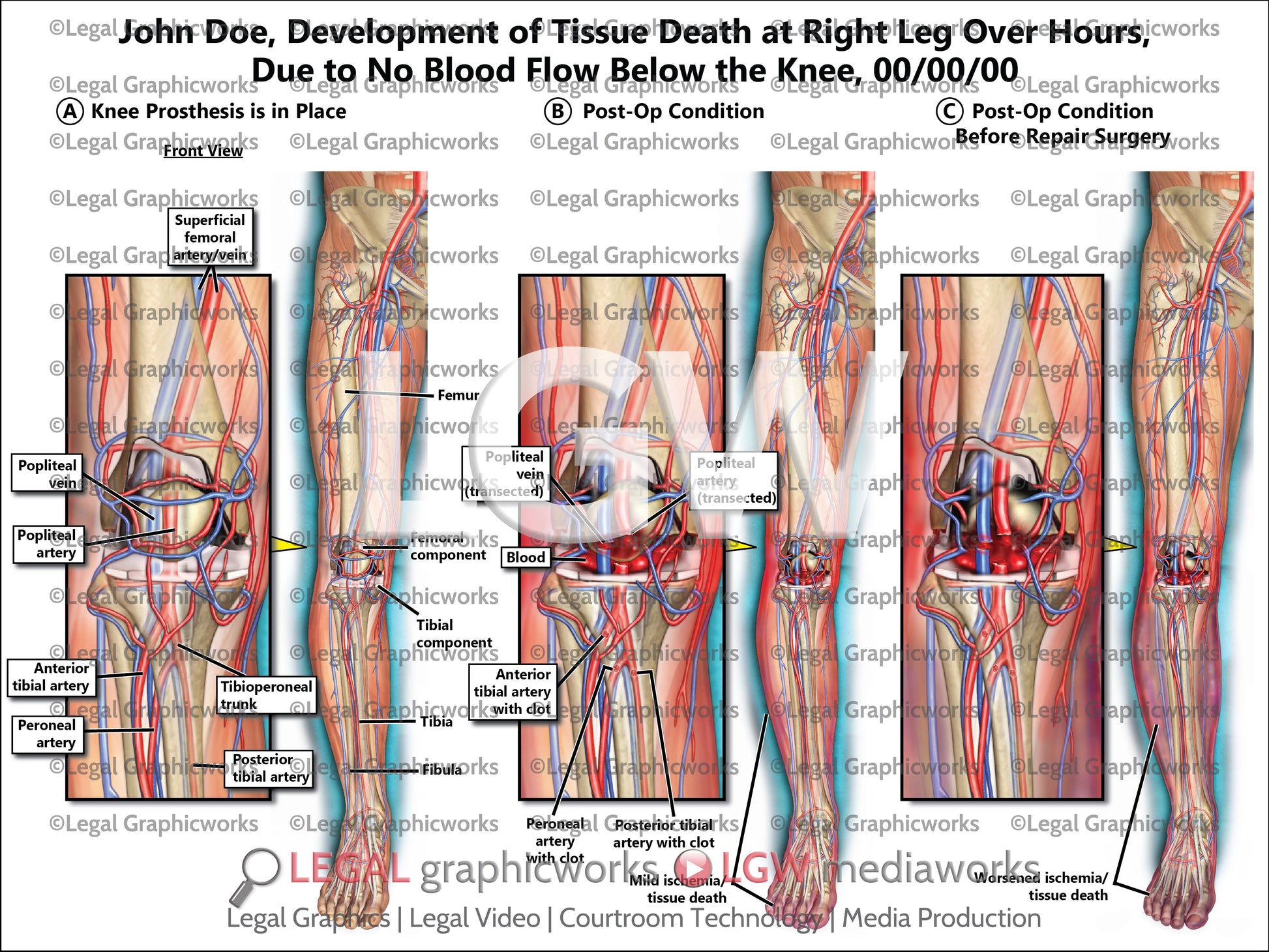 Development of Tissue Death at Right Leg Over Hours, Due to No Blood Flow Below the Knee
