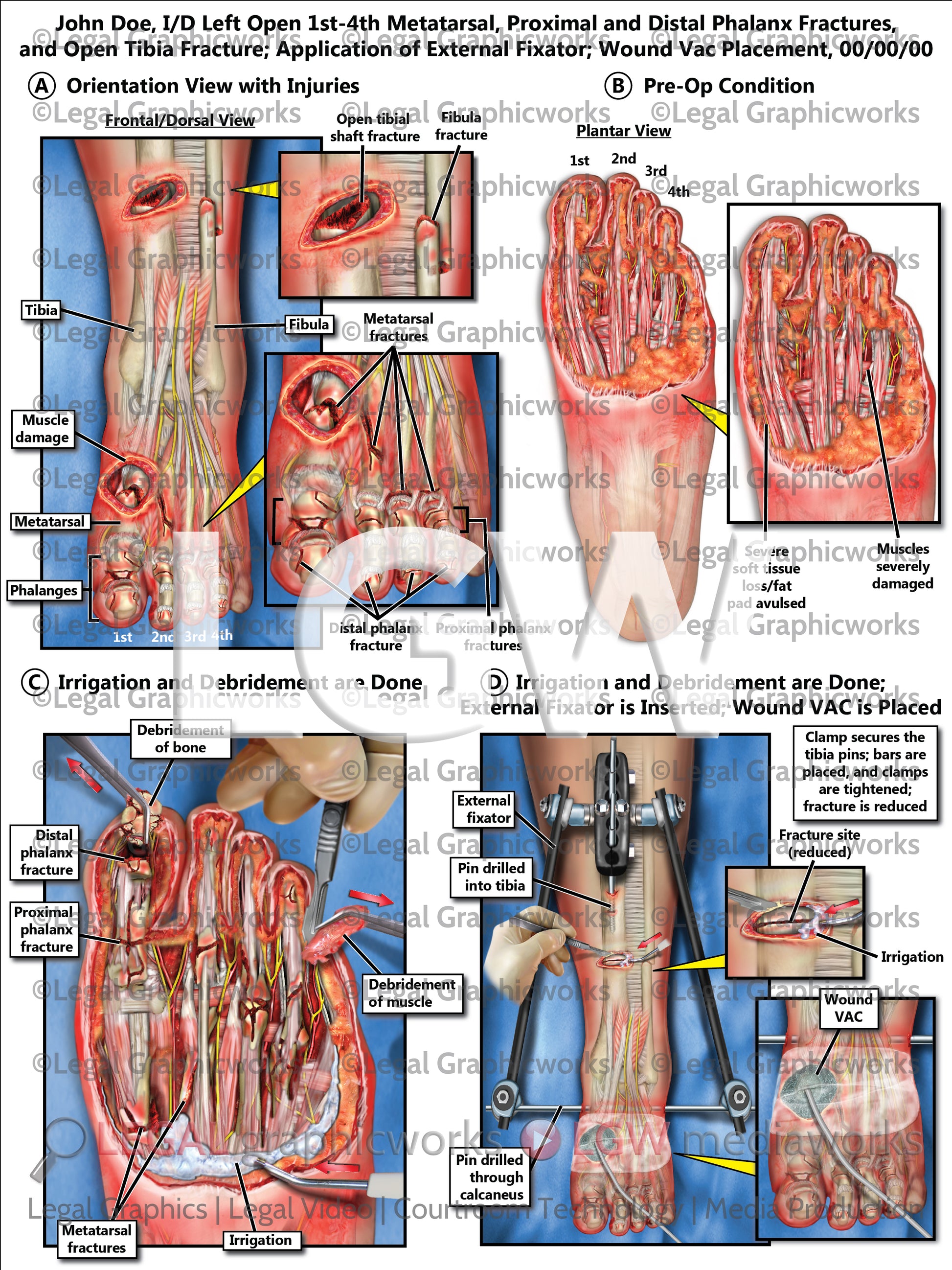 I/D Left Open 1st-4th Metatarsal, Proximal and Distal Phalanx Fractures, and Open Tibia Fracture; Application of External Fixator; Wound Vac Placement